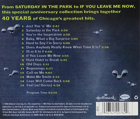 War - The World Is A Ghetto. Best of Chicago. 40th Anniversary Edition was certified Gold by the RIAA on January 11th 2010. 40th Anniversary Edition CD. 40th Anniversary Edition by Chicago CD Oct-2007 2 Discs Rhino Label at the best online prices at eBay. Rhino Records 2 - R2 309116 Format. Includes hits from the bands entire career inclduing 25 or 6 to 4 Saturday in the Park Does Anybody Really Know What Time It Is and many more.