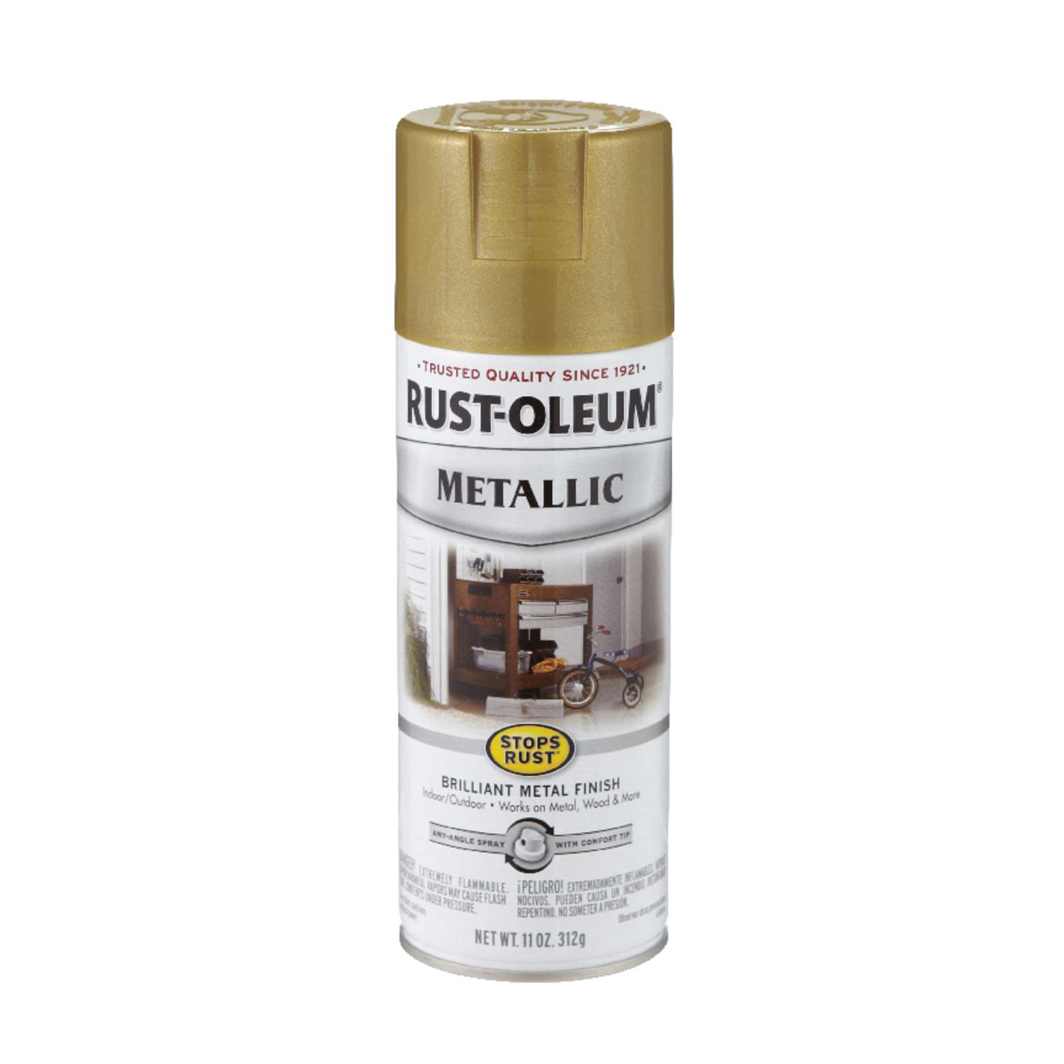 Visit our website for more infor. Rust-Oleum Universal Metallic Spray Paint bring surfaces to life. Rust-Oleum Modern Farmhouse 11 oz. Specialty Metallic Spray Paint contains a leafing pigment it is only for use indoors. Wont rub off or tarnish. Comfort spray tip with wider finger pad reduces fatigue caused by continuous spraying. Rust-Oleum Metallic Elegant Finish is a spray paint for interior and exterior use on a variety of surfaces where a soft metallic sheen is required.