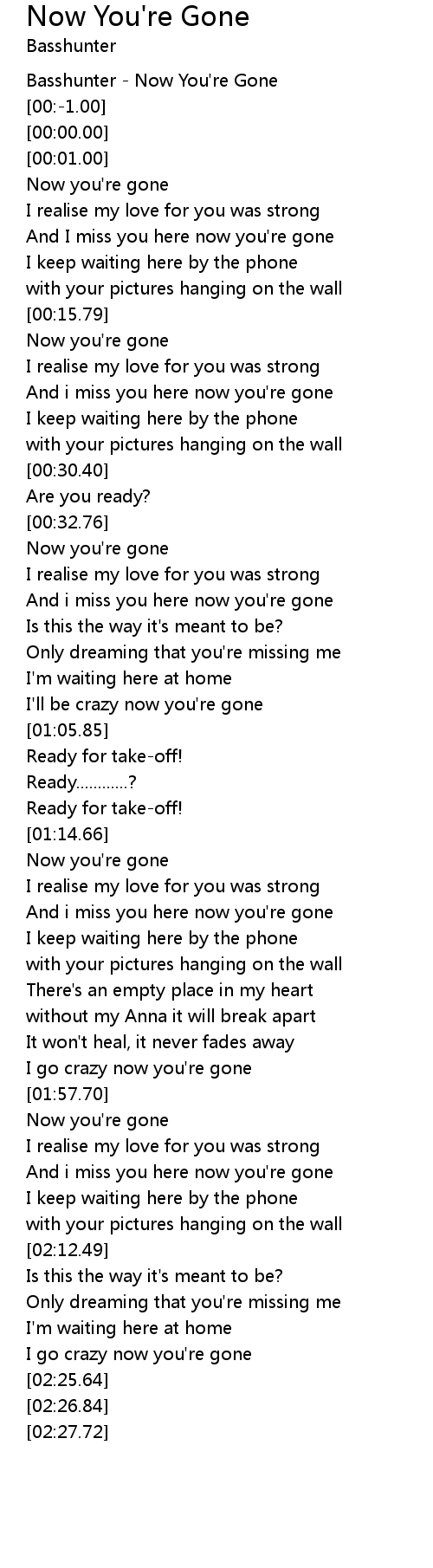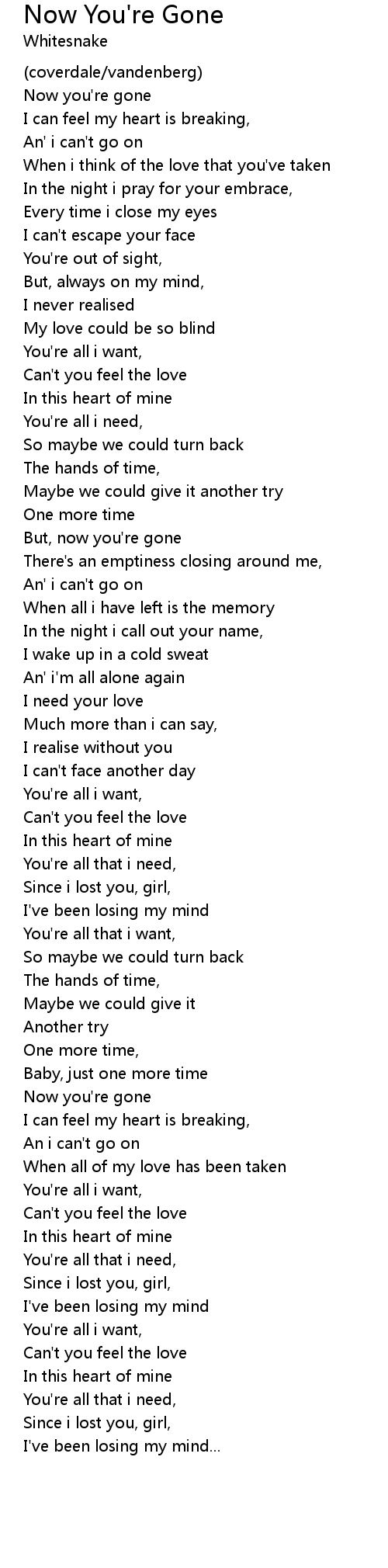Now that you're gone lyrics. And whos gonna love you If it isnt me. When I think of the love that youve taken. Now Youre Gone Trk 20 2.